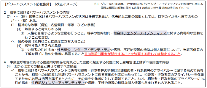「カミングアウト」の強要又は禁止はパワハラに該当し得る旨が明記されます