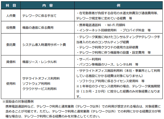 以下は、対象となる経費、テレワーク実施期間に応じた奨励金の額がまとめられた図です。