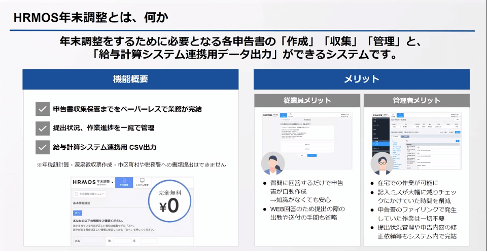 ハーモス年末調整に備わっている申告書の「作成」「収集」「管理」や、「給与計算システム連携データ出力」機能は、すべて無料でご利用いただけます。