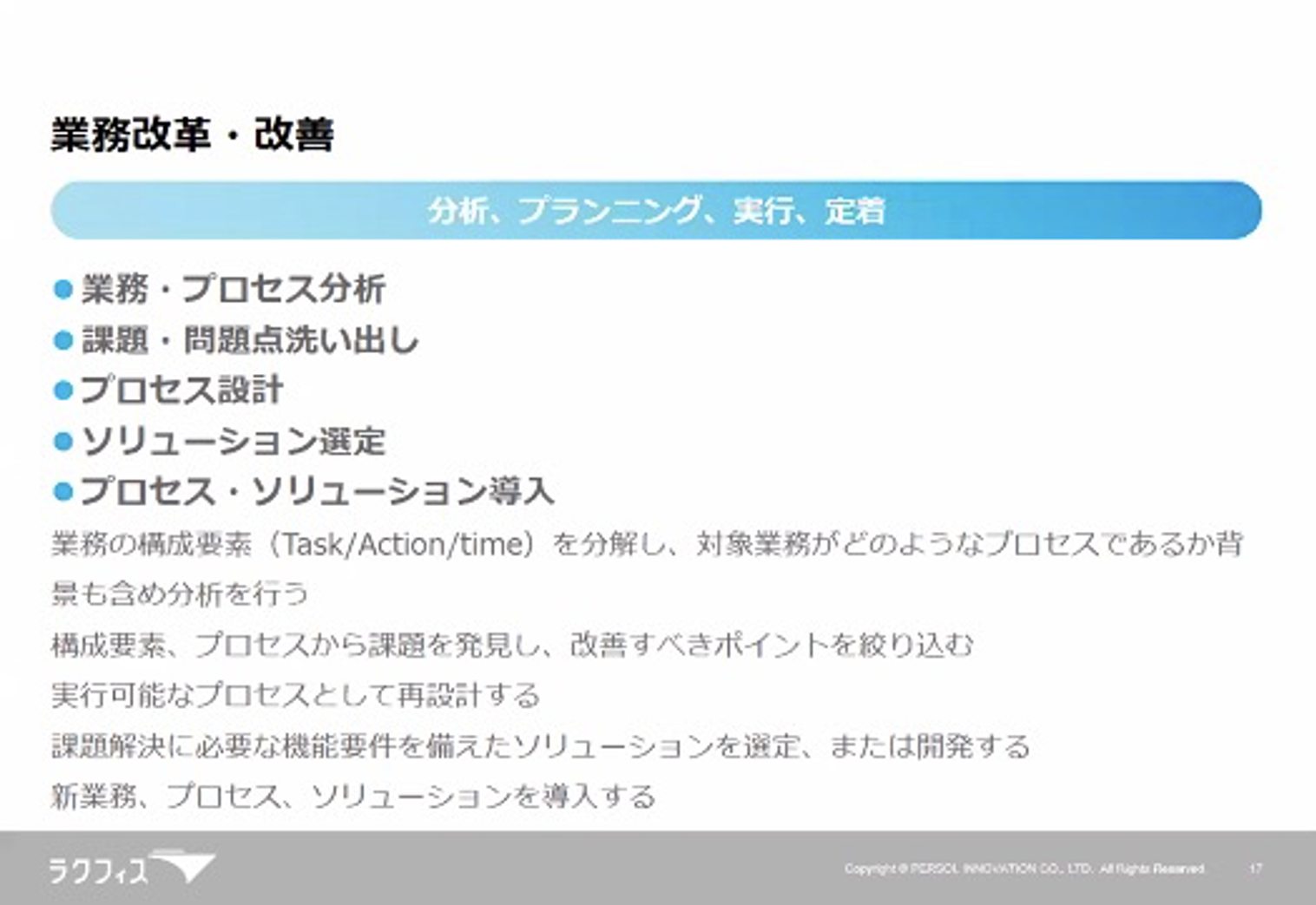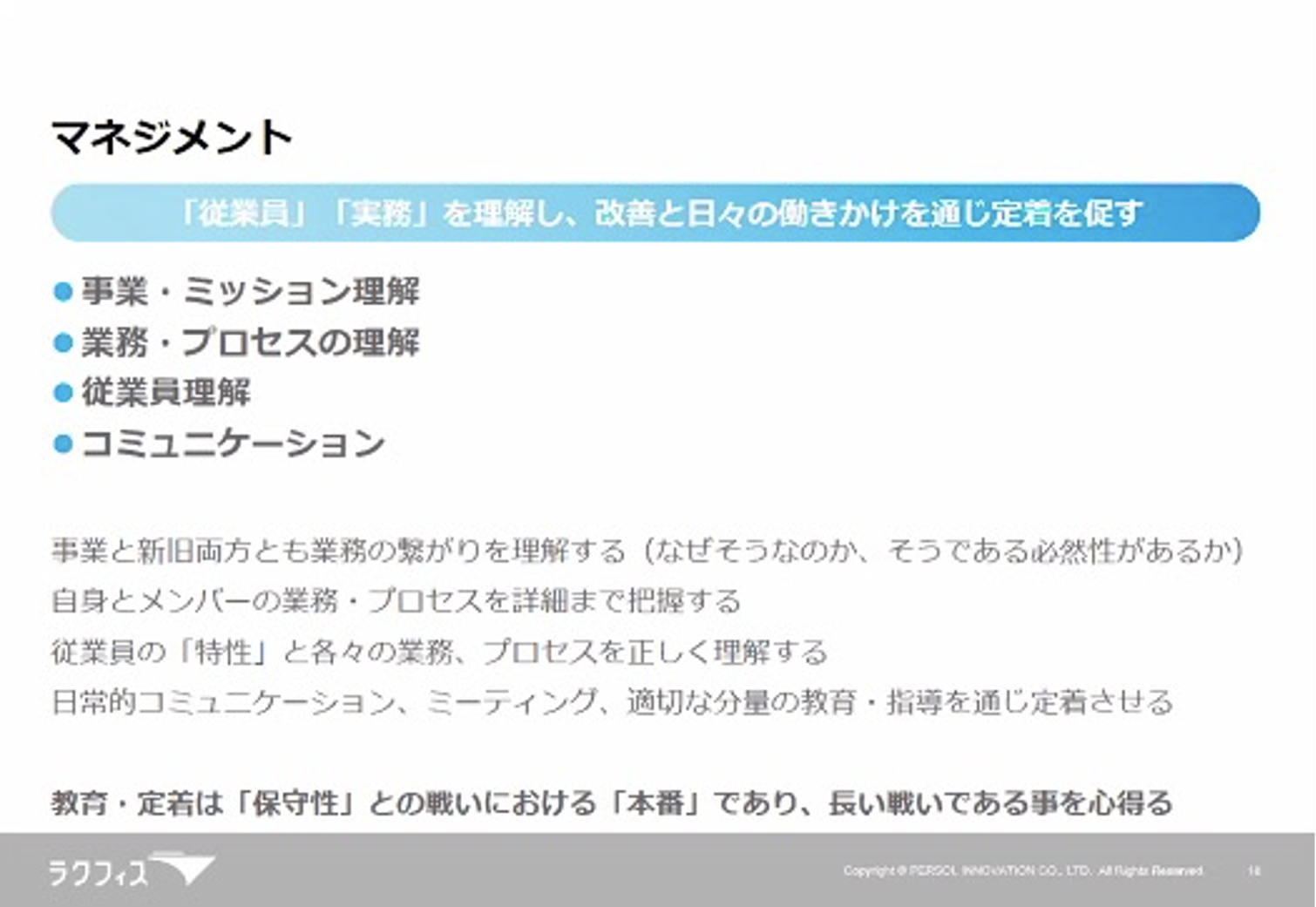業務改革・改善のあとには、それらを定着させるための取り組みが必要となります。「従業員」と「実務」を理解した上で、改善と日々の働き方を通じ、定着を促すマネジメントも重要になります。