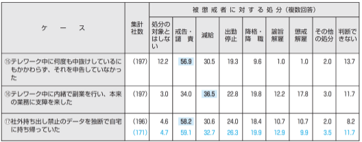 同調査結果では、これらの他にも「30のケース別に見た被懲戒者に対する懲戒処分」を紹介していますので、参考URLよりご確認ください。それぞれの行為について一般的にどのような処分が適用されているのか、実務上参考になる部分も多いのではないかと思います。ご参考までに、テレワークに係る労務管理でよく問題になりがちな行為について、懲戒処分の取扱いをご紹介しておきましょう。初動としては「戒告・譴責」(厳重注意及び始末書提出)での対応が主となり、頻度や悪質性等に鑑み「減給」「出勤停止」等の重い処分に切り替えられているようです。