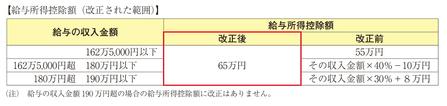 給与所得控除については、これまでは年収額(=給与等の収入金額)に応じて55万円を最大として段階的に設定されていた控除額が、一律65万円に引き上げられます。