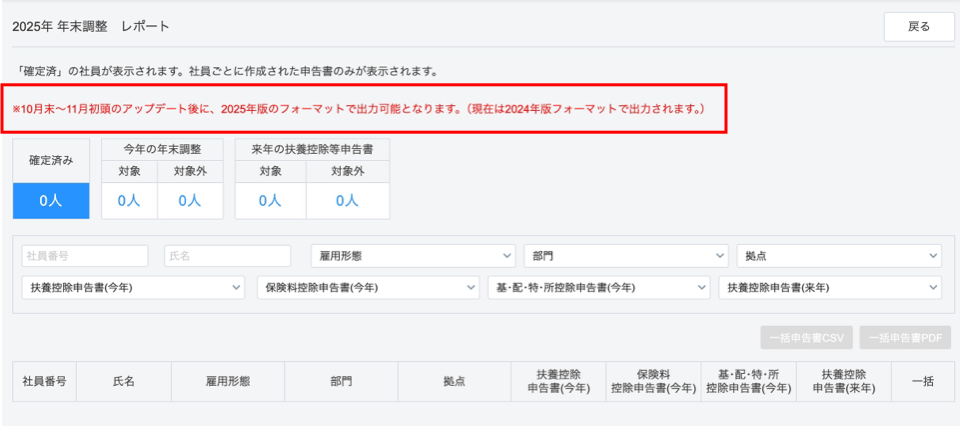 [システム管理>年末調整>レポート]画面からは、年末調整の情報をPDF出力・CSV出力することができます。2025年度(令和7年)のPDF出力・CSV出力機能は、2025年11月頃までにリリースいたしますので、今しばらくお待ちください。