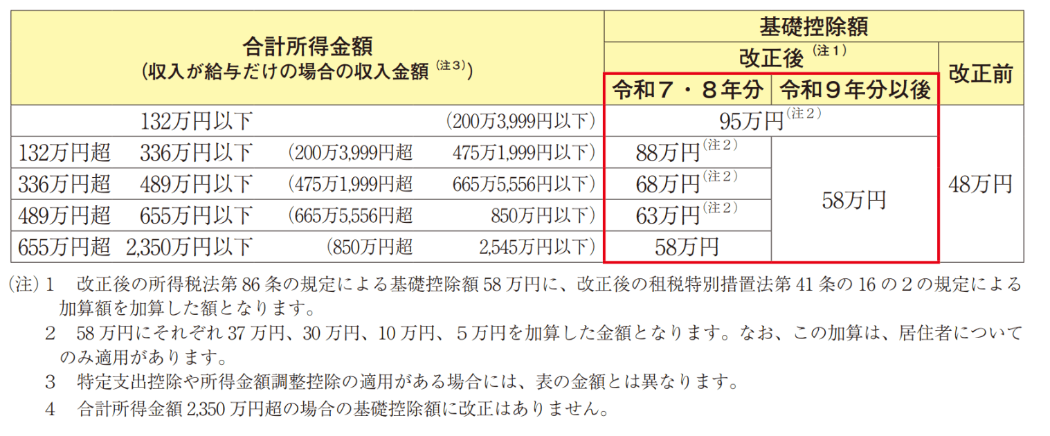 基礎控除については、次のように48万円から最大95万円まで段階的に引き上げられます。