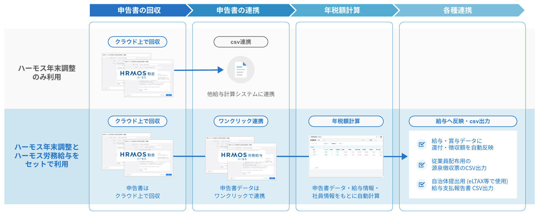 ハーモス年末調整 単体でのご利用の場合、システム内で年税額計算はできませんが、株式会社ビズリーチが提供する労務給与システム「ハーモス労務給与」と連携させることで、以下の業務がシステム内で完結するようになります。