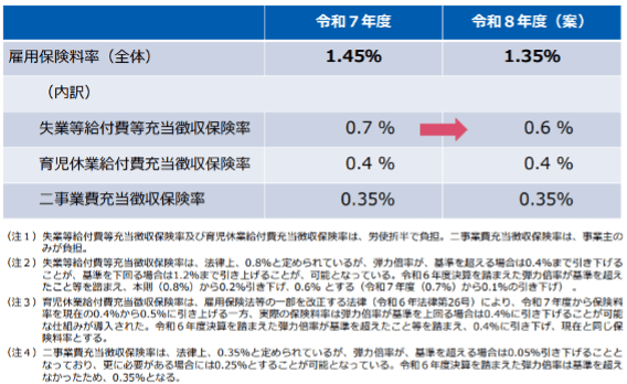 雇用保険料率は、前年における失業手当受給者数や労働者の実質賃金、積立金残高等を参考に、毎年見直されています。2026年度は2025年度同様、引き下げが予定されており、具体的には「0.1%引き下げ」となる見込みです。