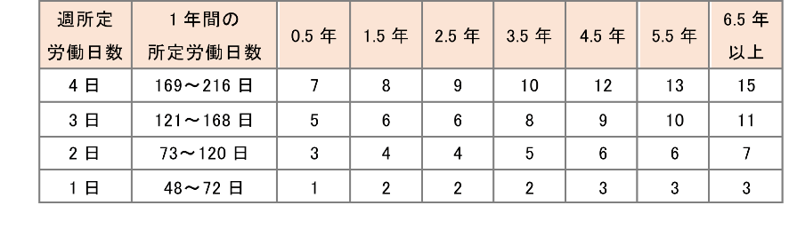 条文そのままですと、結局、どういう人に何日付与しなければならないか分かりにくいですよね。まとめると、以下のような表になります。