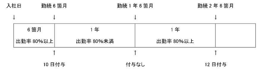 使用者は、その雇入れの日から起算して6か月継続勤務し全労働日の8割以上出勤した労働者に対して、継続し、又は分割した10労働日の有給休暇を与えなければならない。
