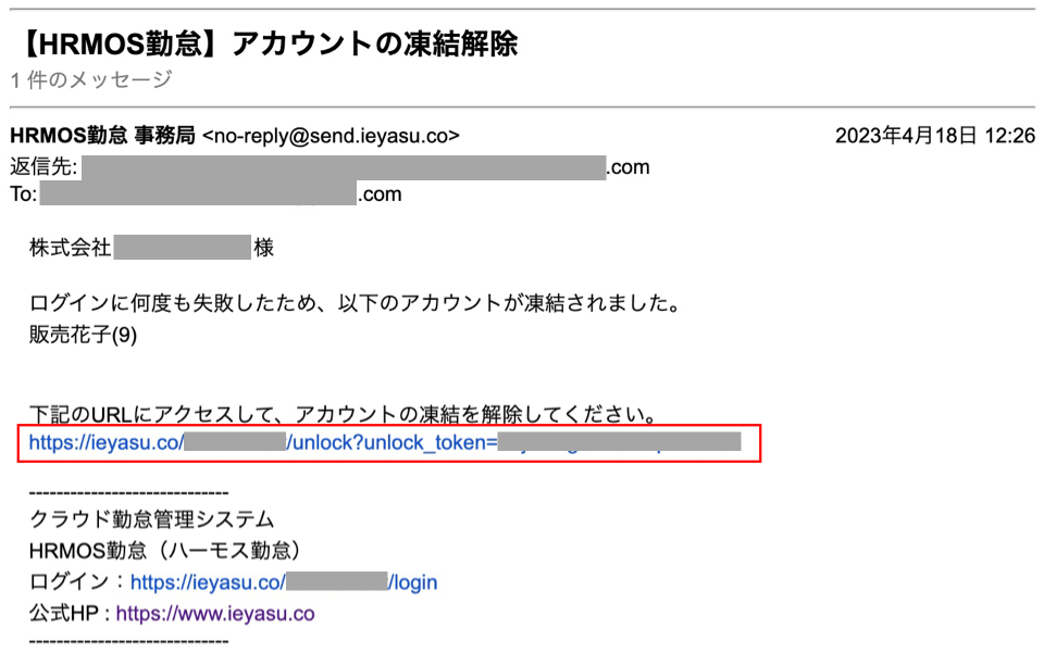 件 名:【HRMOS勤怠】アカウントの凍結解除