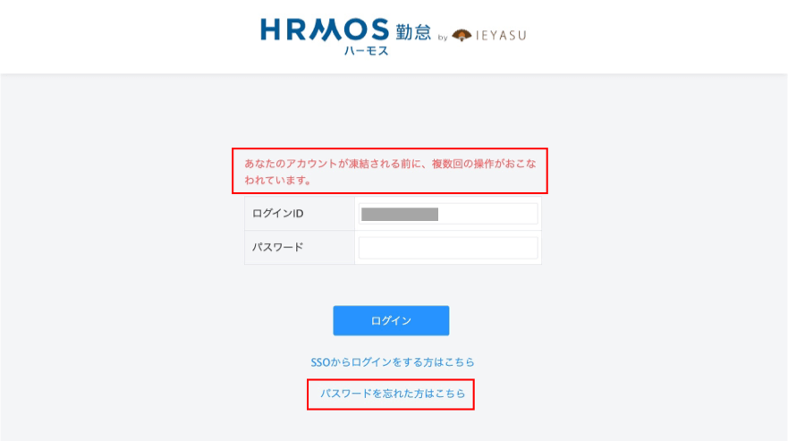 凍結される直前に「あなたのアカウントが凍結される前に、複数回の操作がおこなわれています。」という警告エラーが表示されます。警告エラーが表示されましたら「パスワードを忘れた方はこちら」からパスワードを再設定することをおすすめします。