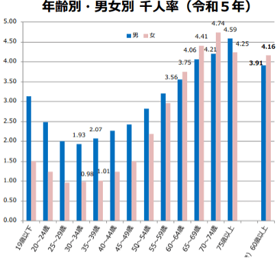 シニア人材の活用が進む中で、問題視されているのは「高年齢労働者の労災発生率」です。厚生労働省の資料によると、「労働災害発生率(千人率)は、男女ともに、若年層と高年齢層で高い」、とりわけ「60歳以上の男女別の労働災害発生率を30代と比較すると、男性は約2倍、女性は約4倍となっている」ことが明らかになっています