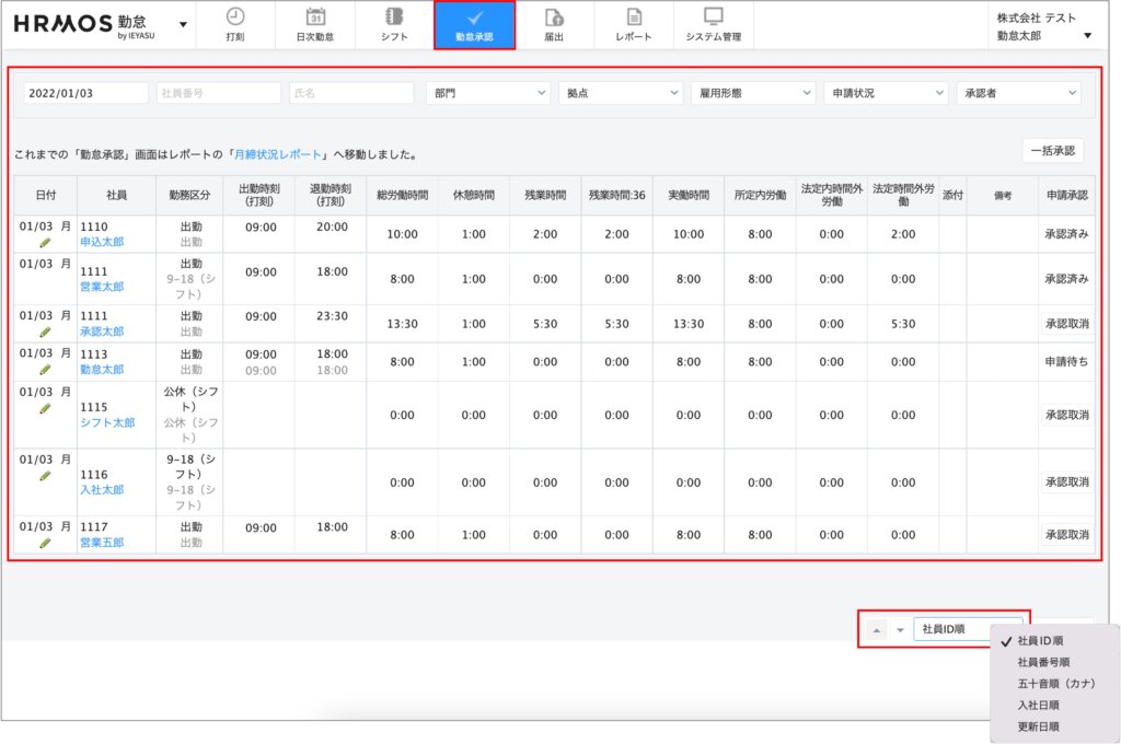 • 勤怠承認画面は社員番号や五十音順などで並び替えも可能