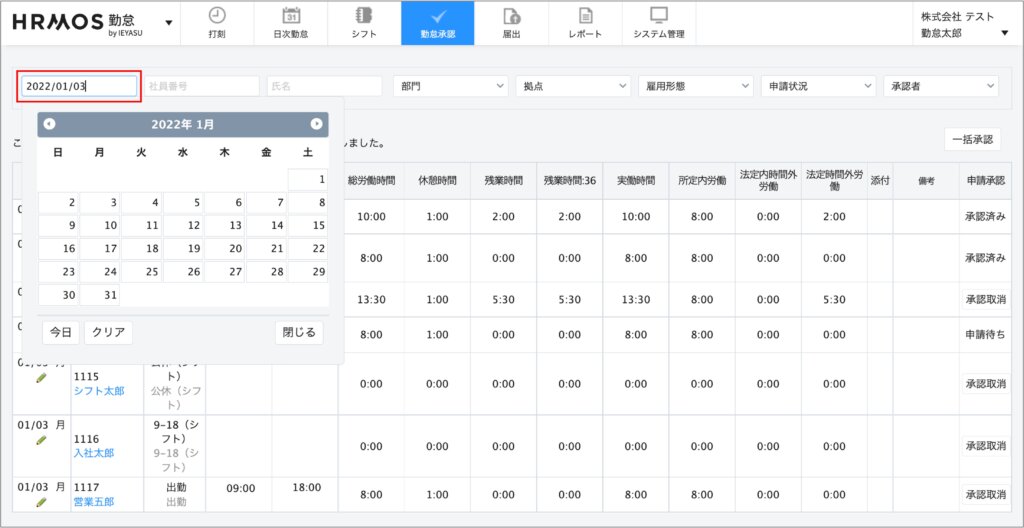 まず、上部メニュー「勤怠承認」画面の左上にある日付入力欄に、勤怠承認を行いたい日付を入力します。