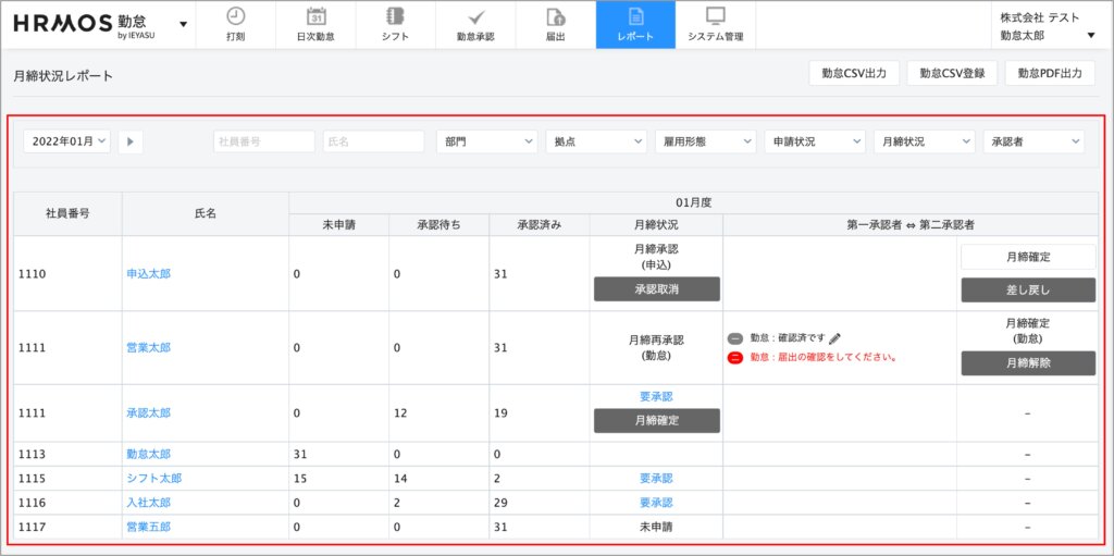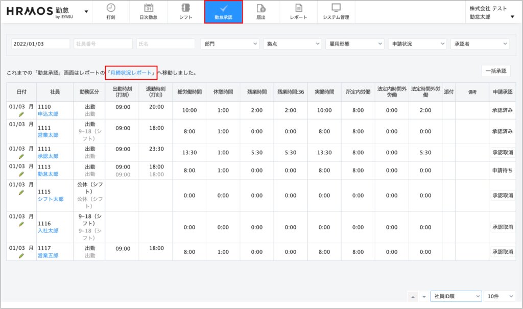 ※なお、上部メニュー「勤怠承認」画面にも、「これまでの「勤怠承認」画面はレポートの「月締状況レポート」へ移動しました。」というメッセージと月締状況レポートへ遷移するリンクを掲載しています(「勤怠承認」画面の変更から約半年~1年の間はこのリンクを掲載する予定です)。