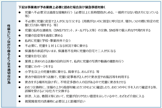 「不適切な行為」の内容は、各施設・事業の性質や対象児童等の年齢・発達の状況等によって異なることが想定されます。「教育・保育等を提供する事業者による児童対象性暴力等の防止等の取組を横断的に促進するための指針」(令和7年4月こども家庭庁)における例示を参考に、各事業者の実態に応じて明確化することが適当です。ただし、従事者が実際に業務に携わるにあたり、就業規則上での行為の明確化が従事者の委縮を招く結果につながらないよう留意する必要があります。