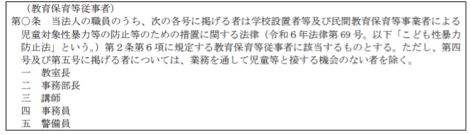 本項目に規定例は、こども家庭庁通知「学校設置者等及び民間教育保育等事業者による児童対象性暴力等の防止等のための措置に関する法律の施行に向けた周知依頼について(令和7年9月30日こども家庭庁支援局長通知)」の12枚目にてご確認いただけます。