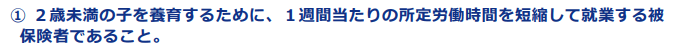 ⇒被保険者が子を養育するために短時間正社員、パートタイム労働者等に転換したことに伴い、転換前と比べて1週間当たりの所定労働時間が短縮されている場合は、育児時短就業と取り扱う