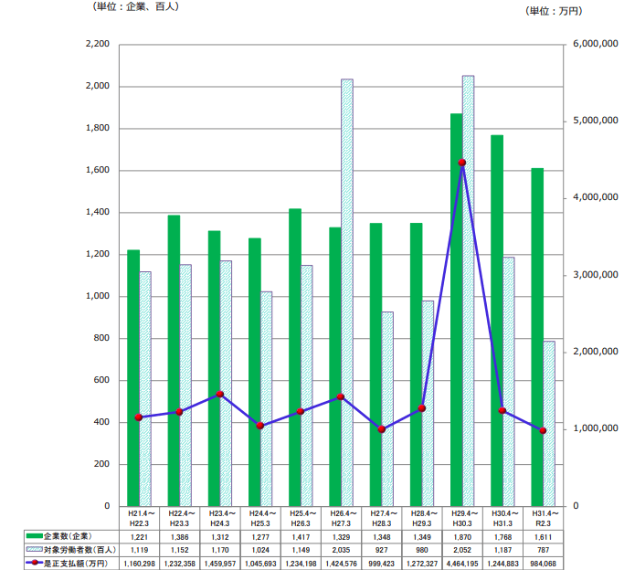 上図は、過去10年間の「100万円以上の割増賃金の遡及支払状況」を棒グラフ、折れ線グラフで示したものです。対象企業、対象労働者数、是正支払額の各項目は2017年度に急激に数を増していますが、2018年度、2019年度と連続で減少傾向にあり、働き方改革を契機とした企業における意識の変化を見てとることができます。