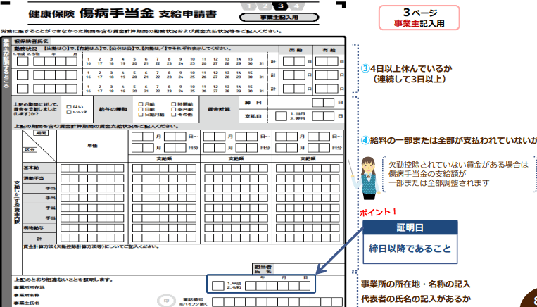 申請では、原則として私傷病により労務不能と認められる期間について、その期間経過後に証明を受けることになります。休業期間が長期となる場合で給与締日ごとに申請する際には、あらかじめ医師に証明を受けたい期間を伝えておく必要があります(傷病手当金は、最大3か月まとめて申請することもできます)。