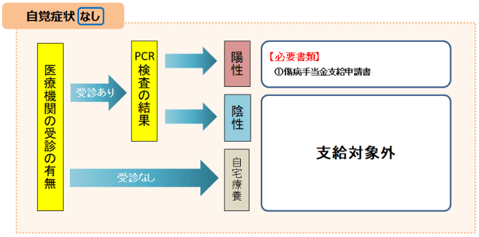 - 自覚症状があっても、PCR検査の結果「陰性」だった場合、陰性が判明するまでの間のみ支給対象とし、陰性判明日以降は支給対象外となります。