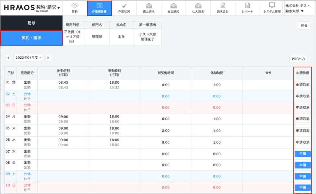 画面左上ロゴメニューを「契約・請求」に切り替え、上部メニュー「作業報告書」をクリックします。出勤簿にある勤怠情報を確認し、問題がなければ「申請承認」列の青色の「申請」ボタンをクリックし日次勤怠を申請します。