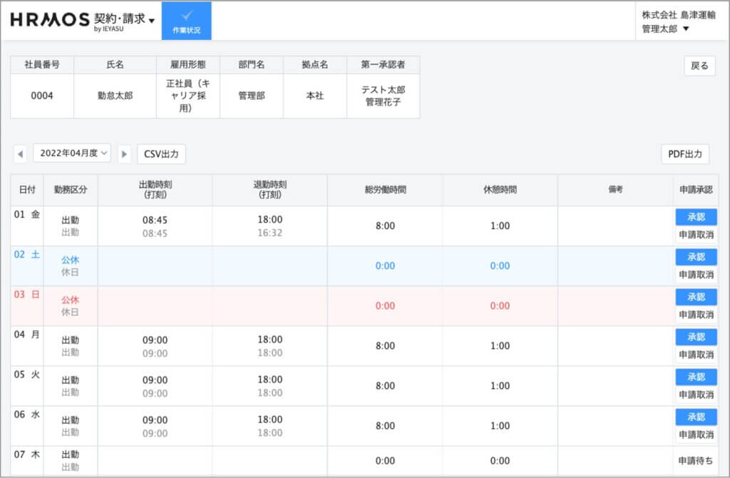 出退勤・休憩などを確認し、問題がなければ「申請承認」列の青色の「承認」ボタンをクリックしてください。