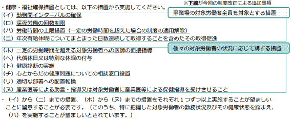 併せて、「労働基準法第38条の4第1項の規定により同項第1号の業務に従事する労働者の適正な労働条件の確保を図るための指針」等が改正され、対象労働者の健康・福祉確保措置が強化されました。