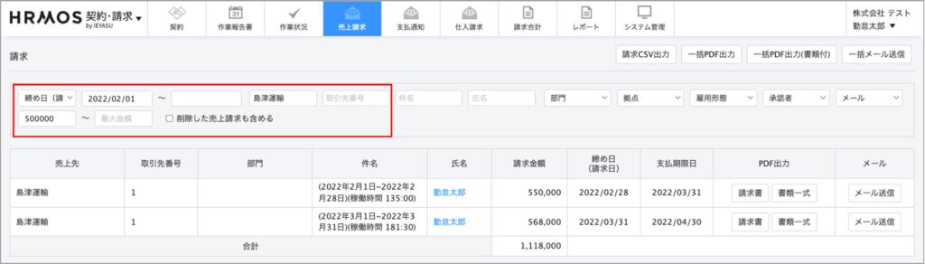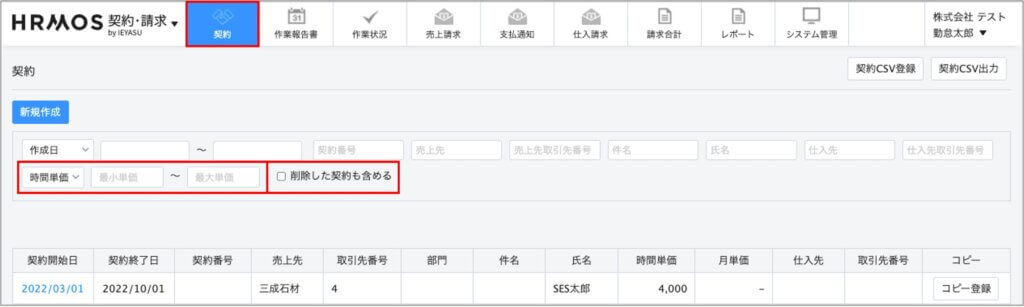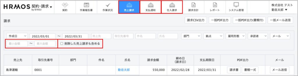 [画面左上ロゴメニュー「契約・請求」>上部メニュー「契約」「売上請求」「支払通知」「仕入請求」]の画面では、以前より「取引先」「従業員情報」「契約開始日などの日付」で検索・絞り込みができていましたが、今回この検索・絞り込み項目に以下2つの項目を追加いたしました。