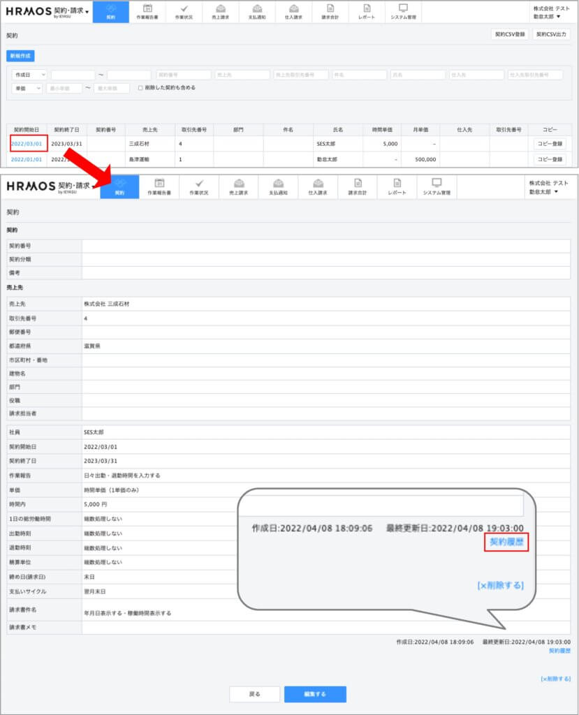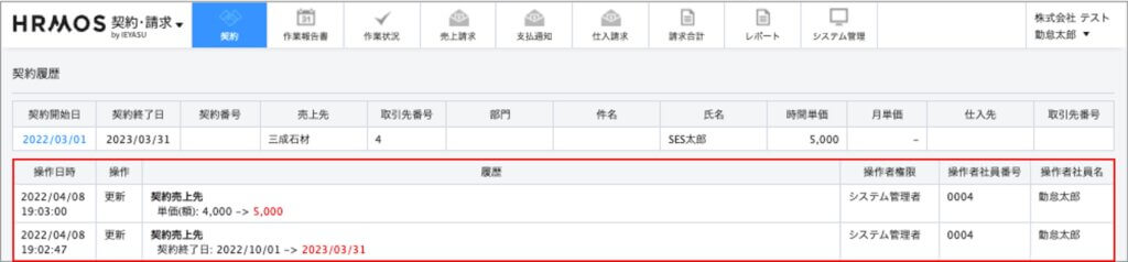 この履歴画面では、詳細画面で確認していた契約(売上請求/支払通知/仕入請求)が、いつ・誰に・どのように変更されたのかを確認できるようになっています。