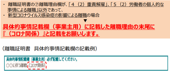 該当者には、離職証明書の具体的事情記載欄(事業主用)に「(コロナ関係)」と記載