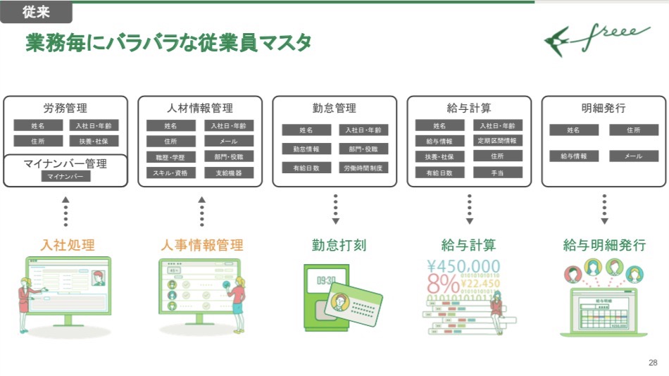 しかし、HR系のシステムは、給与計算システム、勤怠管理システム、給与明細発行システム、マイナンバー管理システム、労務管理システムなど、個別特化型のものが多く、それぞれのシステムでマスタを管理する必要があります。入社・扶養・氏名変更・部署異動など、情報の更新が頻繁に起こる人事業務において全てのマスタを更新し続けることは困難です。