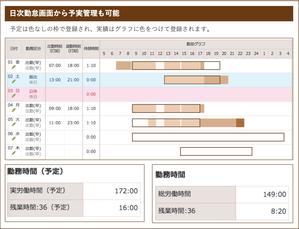 日時勤怠管理では「予実管理」が、そして日報管理では「プロジェクト毎の工数管理」を行うこともできます。単純な時間管理をするだけではなく、作業にかかる時間を意識することを促すシステムを作っています。効率化できる部分とアウトソースできる部分を見極め判断し、有効的に時間を使う働き方を実現させましょう!