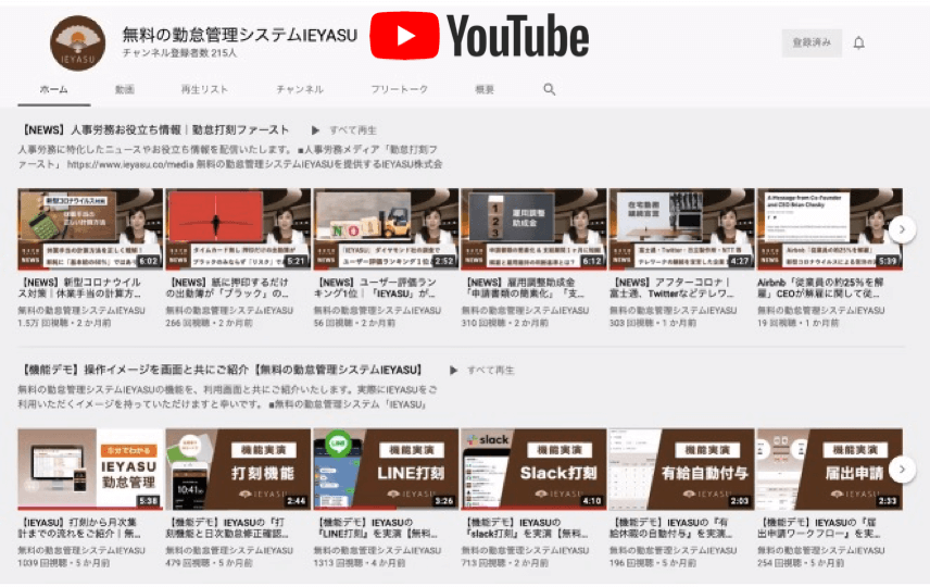 IEYASUの初期設定動画や、機能を紹介する動画はもちろん、無料公開しているセミナーやオンライン質問会の動画、さらには人事労務に関するお役立ち情報を配信するNEWS動画など、様々な動画を配信しています。
