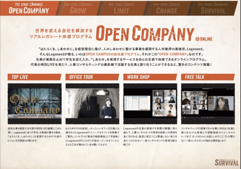 「OPEN COMPANY」という3時間のオンライン会社説明会では、社長講話・オフィスツアー・座談会・ワークの内容を盛り込みました。