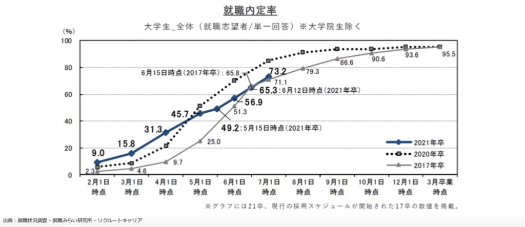 ●就職内定率は7月1日時点で、2021卒は73.2%。2020卒は85.1%で、11.9pt減少