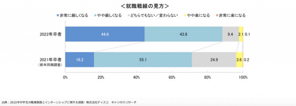 ●22卒の就活生は昨年よりも 就活が「非常に厳しくなる」が約30ptも増加。 危機感の強さから早期活動準備に繋がっている