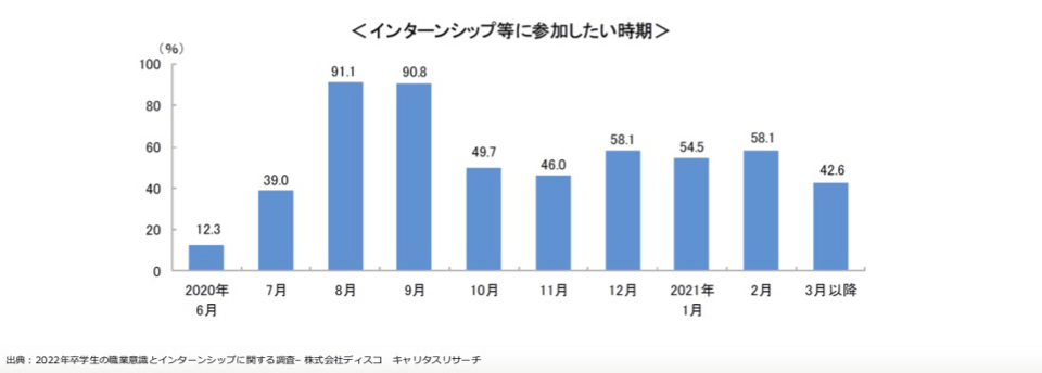 ●インターンの参加時期は夏季休暇中の8・9月に集中。 但し、10月以降も約50%前後を推移しており、 早くも秋・冬の参加を検討している学生も多く、 インターンと採用の直結は今後も継続する
