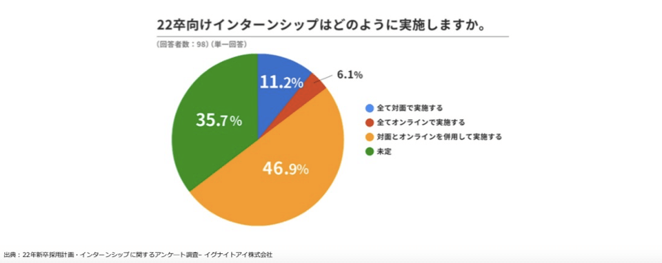 ●インターンシップを全てをオンラインで実施する企業は約6%。 対面とオンラインの併用型を約47%の企業が予定。 但し未定が約35%あり、実施方法を模索している企業も多い