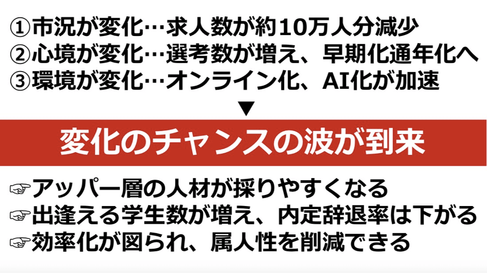 2045年に人類の知能を超える 「シンギュラティ」を迎えるという見方もある中、ビジネスモデルの転換期にさしかかっています。「過去20年会社で活躍している社員が、次の20年にも同じように活躍できるか」という視点をもって採用に臨む必要があります。