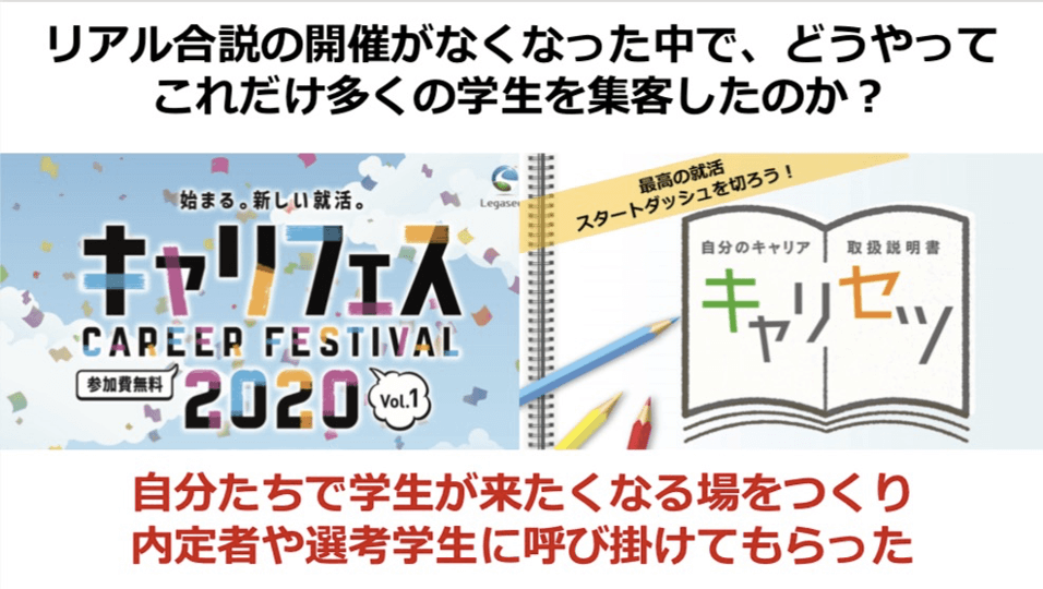 懸念していたオンラインでの集客についても、新人の社員と内定者を中心に企画をしてもらい「自分たちで学生が来たくなる場をつくり」「内定者や選考学生に呼び掛け」を行なってもらう自社マーケティングにより集客を行いました。
