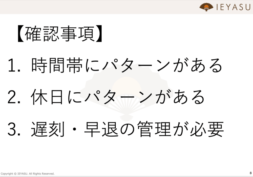 クラウド勤怠管理システムIEYASUを用いてシフトを管理する場合、以下3つの確認事項をもとに、タイプ別の最適な運用方法をお選びいただけます。