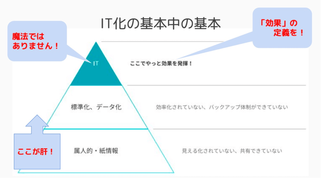 ITは、「システムを導入すればすべての課題が解決する」というような魔法ではありませんので、(ピラミッドの1段目から)地道に解決しなければなりません。