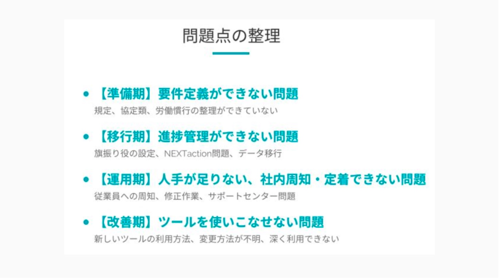 導入が決定したあとにも、「移行期」「運用期」「改善期」などのタイミングごとに問題は発生します。
