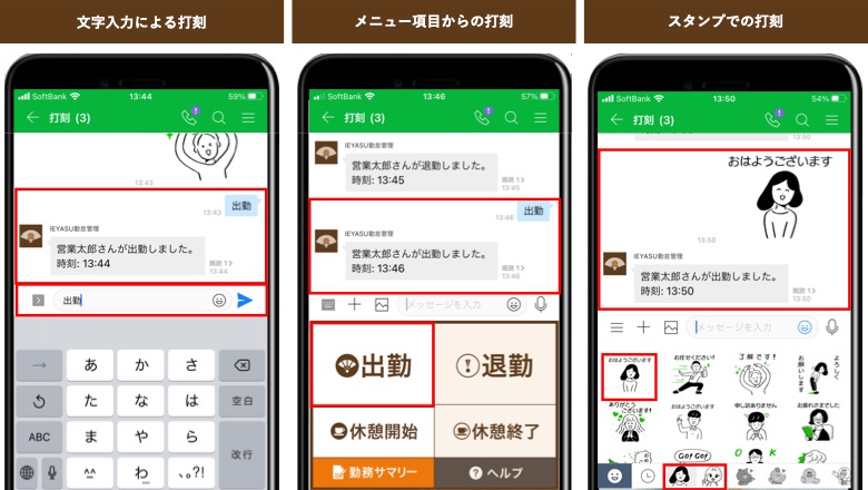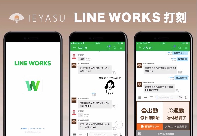 クラウド勤怠管理システム「IEYASU」と、ビジネス版LINEの「LINE WORKS」を連携させることで、LINE WORKSのトーク画面上から、出退勤打刻ができるようになります。