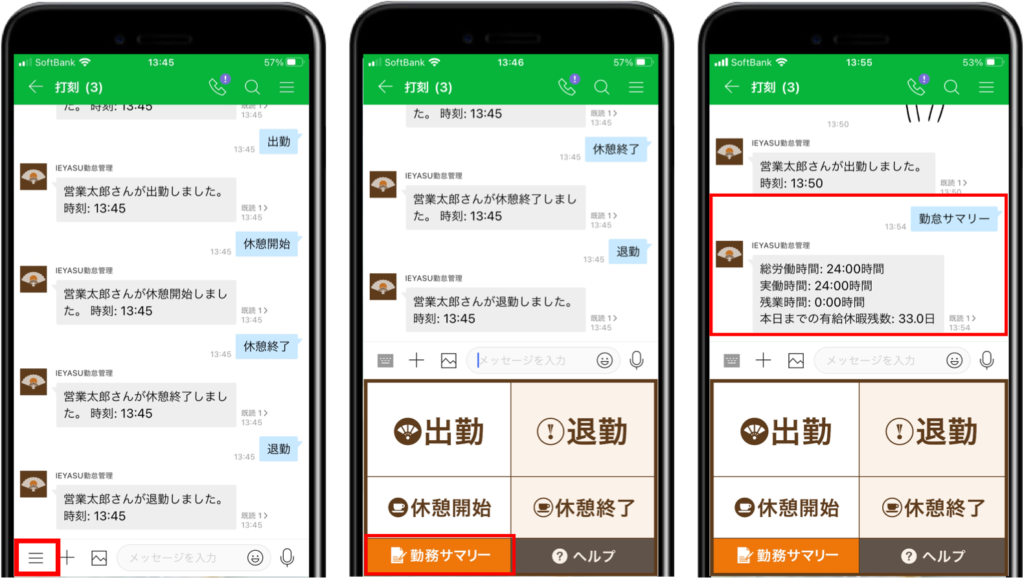 トークルームの文字入力欄の左側にある「3本線マーク(≡)」をクリックすると、IEYASUの打刻メニューが表示されます。そのメニュー項目をクリックすることで打刻ができるようになります。