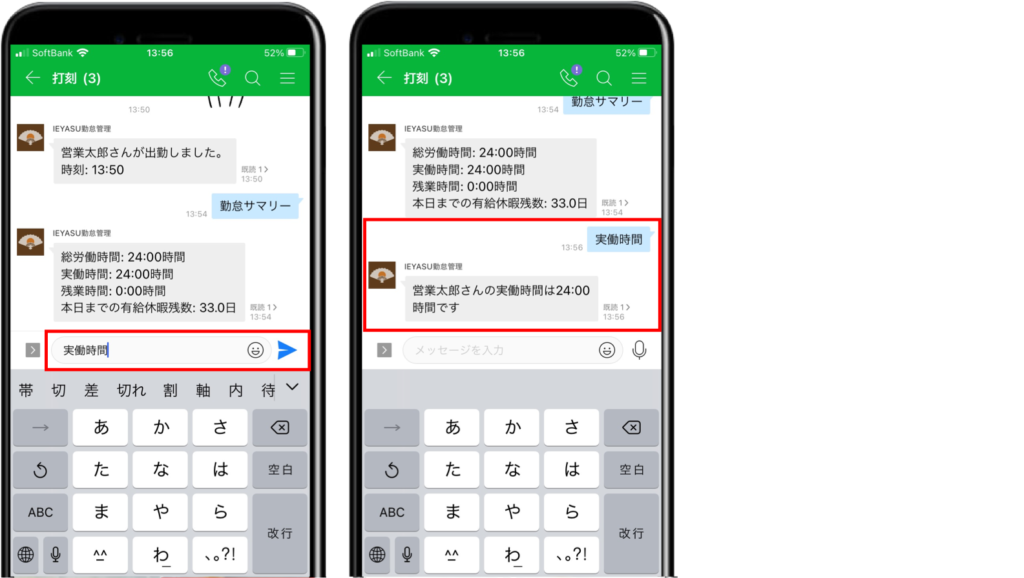 「IEYASU」と「LINE WORKS」を連携させることによって、自身の勤務状況をLINE WORKS上から簡単に確認できるようになるため、上記のような問い合わせも「LINE WORKS上で確認してください」という一言で完了します。