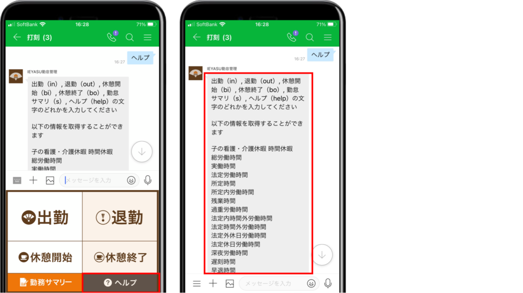 勤務状況に関する項目は、メニュー項目「ヘルプ」をタップすることで確認することができます。