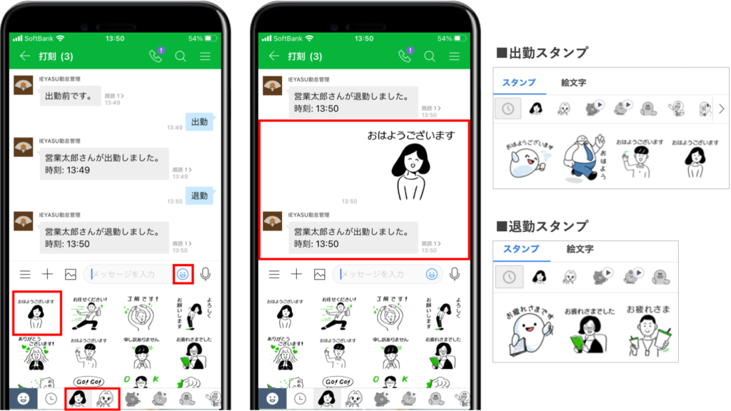 出勤打刻・退勤打刻と紐づいたスタンプをご用意しています。そのスタンプを入力することで、出勤、退勤打刻ができます。