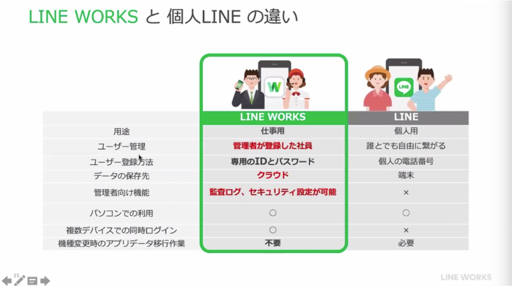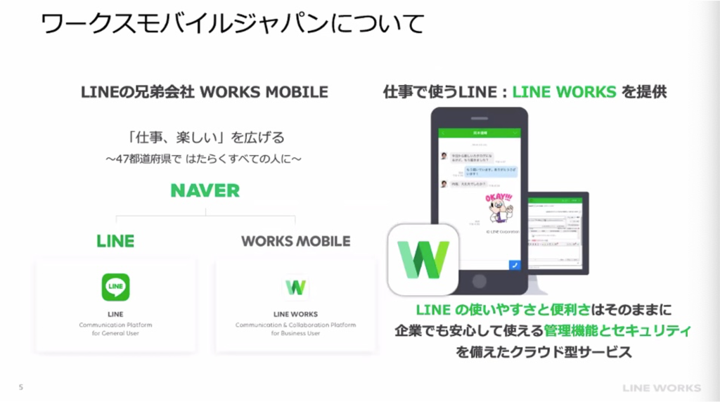 ビジネス版LINEの「LINE WORKS」を提供しているワークスモバイルジャパン株式会社は、モバイルメッセンジャーアプリ「LINE」を提供しているLINE株式会社の兄弟会社にあたります。