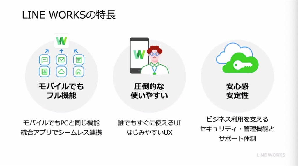 「LINE WORKS」は、LINEの使いやすさと便利さはそのままに、企業でも安心して使える管理機能とセキュリティを備えたクラウドサービスです。